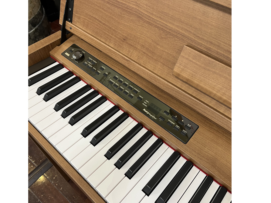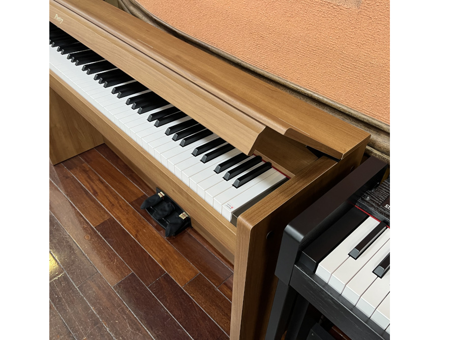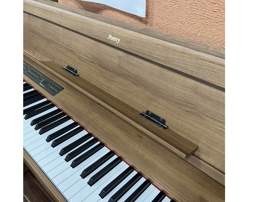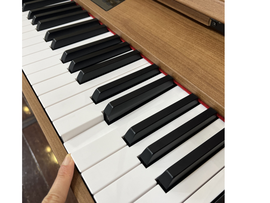 落ち着いた木目調の外装や鍵盤やペダルの根本に赤いフェルトを施し、お部屋に溶け込みやすい上質な雰囲気に仕上がっています。