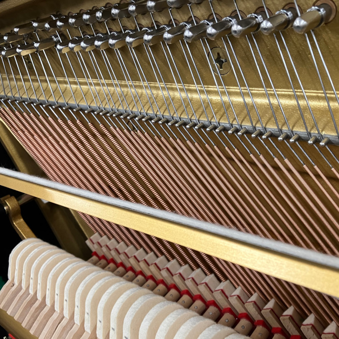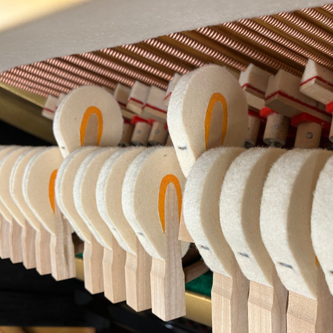音の要となるハンマーには、オールアンダーフェルトを採用しています。ハンマーの内側を硬くし外側を柔らかくすることにより、打鍵にの加減よる音色・響きの幅が広がります。アンダーフェルトは、88個全てに施しています。